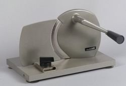 Trancheuse manuelle JUPITER sur pieds, en métal léger, laqué gris clair avec plaque de base à revêtement, lame inoxydable, 170 mm Ø. 4 pieds ventouses, filetés